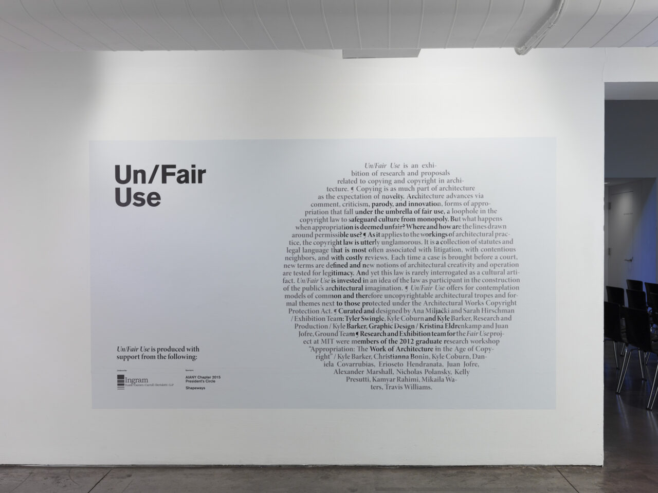 Un/Fair Use, was presented at the Center for Architecture in New York. The exhibition, exploring issues of copying and copyright in architecture, was curated and designed by designer, editor, and writer Sarah Hirschman and Ana Miljački, PhD, Professor of Architecture at Massachusetts Institute of Technology.
